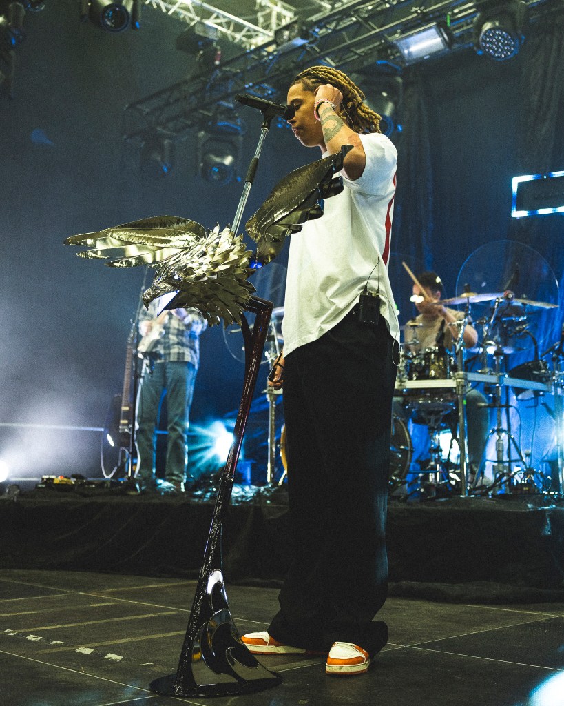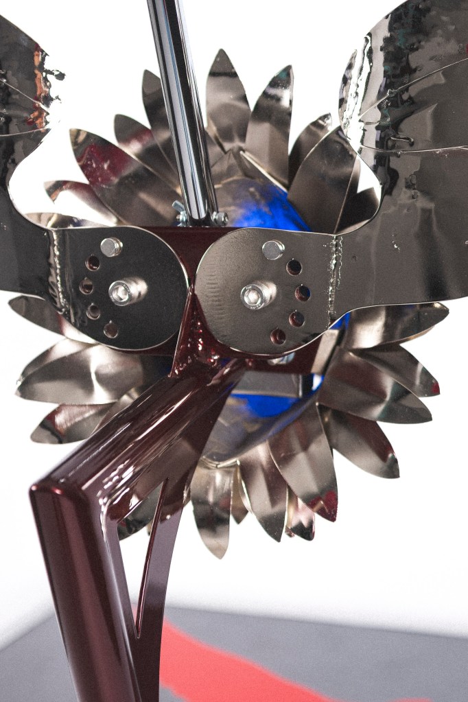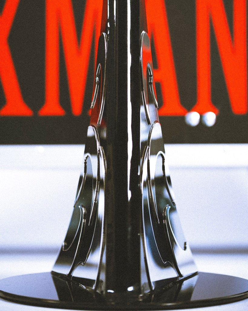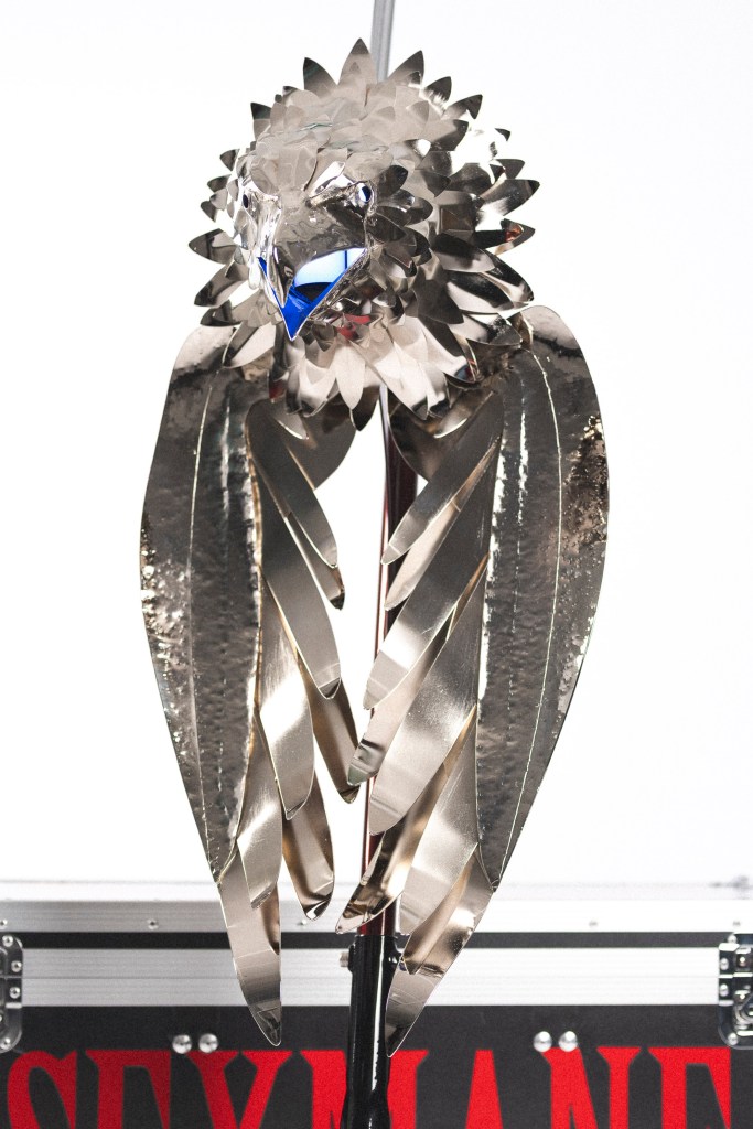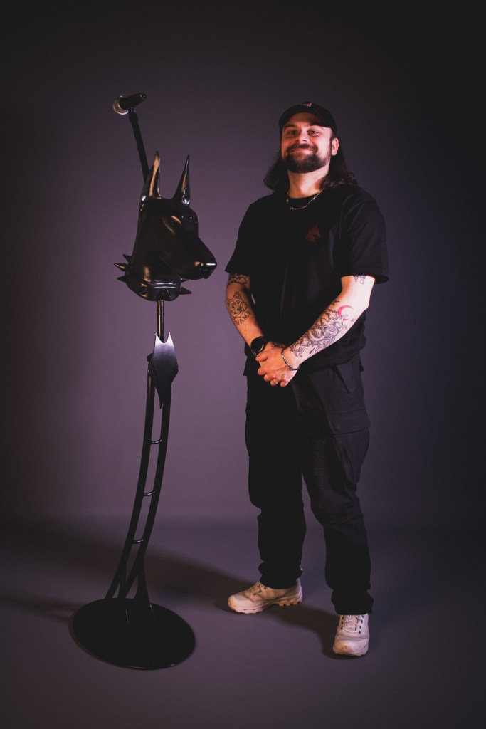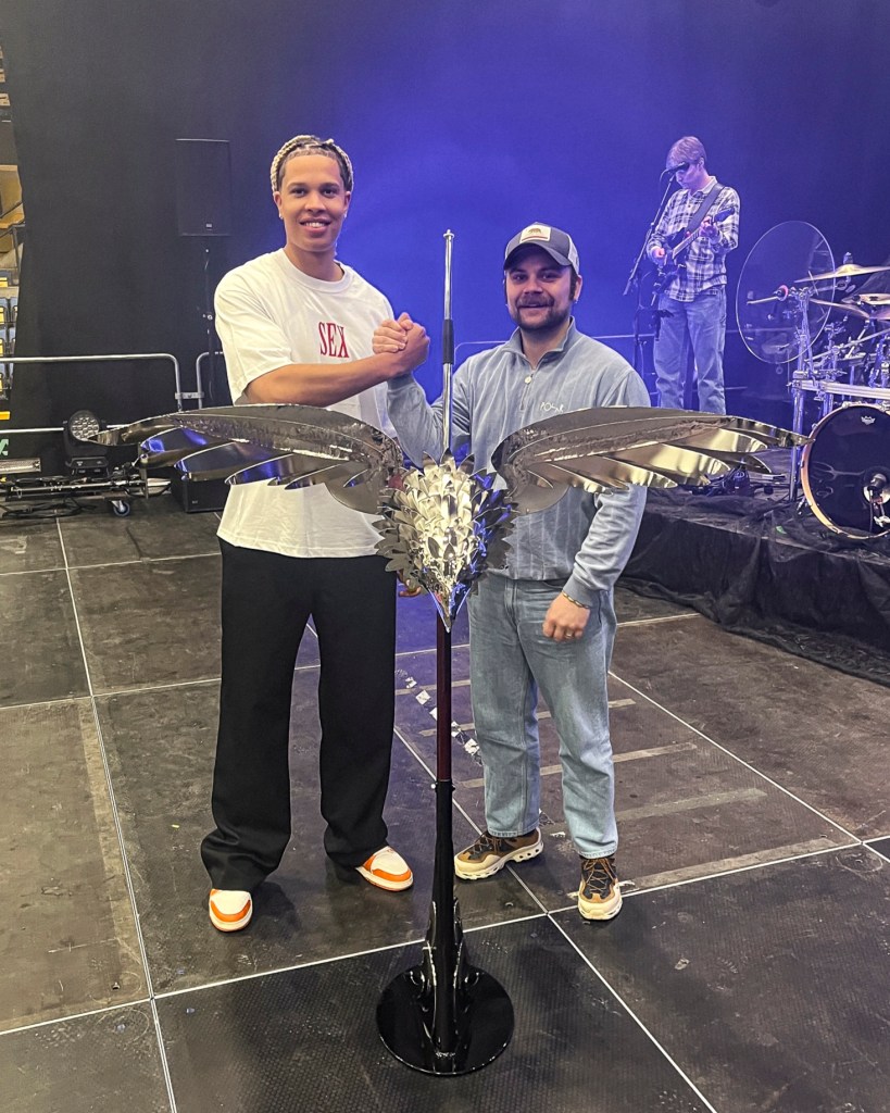 Keväällä 2025 sain tehdä kustomoidun mikrofonitelineen musiikkiartisti Sexmanelle. Artistin toiveena oli saada mikkiteline, jossa on kotka. Tämä oli tähän astisista projekteistani kunnianhimoisin, työläin ja veistoksillin. Ensimmäistä kertaa ikinä veistin tämänkaltaista kokonaisuutta, ja tässä tapauksessa kotkan sulka kerrallaan, joten kyseessä oli muotoilullisesti ja taiteellisesti haastava projekti. Tämän työn aikana korostui visuaalisuuden ja käytännöllisyyden symbioosi, koska suuria ja näyttäviä elementtejä oli paljon, jolloin kokonaisuuden tuli olla entistä toimivampi ja käyttäjäystävällisempi. Konseptin saattaminen siihen vaiheeseen, että teline on myös helposti kuljetettavissa ja toimii niin lavalla kuin sen ulkopuolellakin, vaati paljon suunnittelutyötä. Sexmanen mikkiteline toimitettiin 3.5.2025 Olvi-Areenalle artistin Sanansaattaja-kiertueen viimeiselle keikalle. Tämä mikrofoniteline oli samalla opinnäytetyöni aihe. Opinnäytetyöhöni, Pajalta Parrasvaloihin – Kustomoidun mikrofonitelineen suunnittelu ja valmistus musiikkiartistille, voi tutustua Theseuksessa oheisen linkin kautta.
