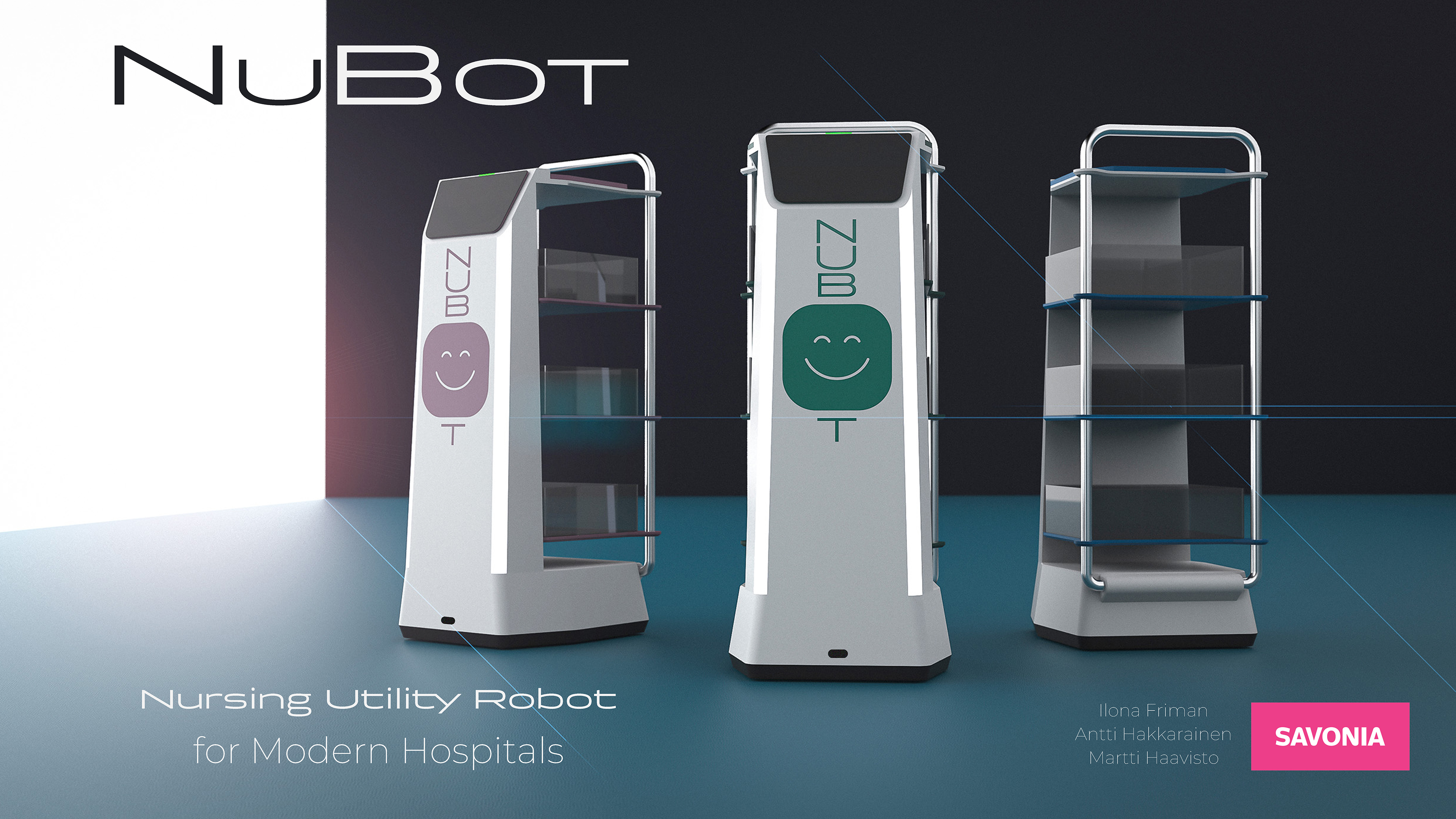 Designed together with my fellow students Ilona Friman and Antti Hakkarainen, NuBot is a utility robot for nurses in the hospital environment. Its main goal is to save nurses’ valuable time by transporting basic care supplies to a desired location when needed. Thus nurses don’t need to leave their spot when working closely with patients which directly contributes to patient safety and saves time and money.