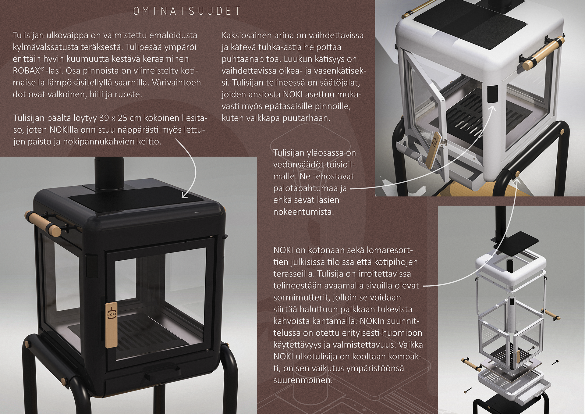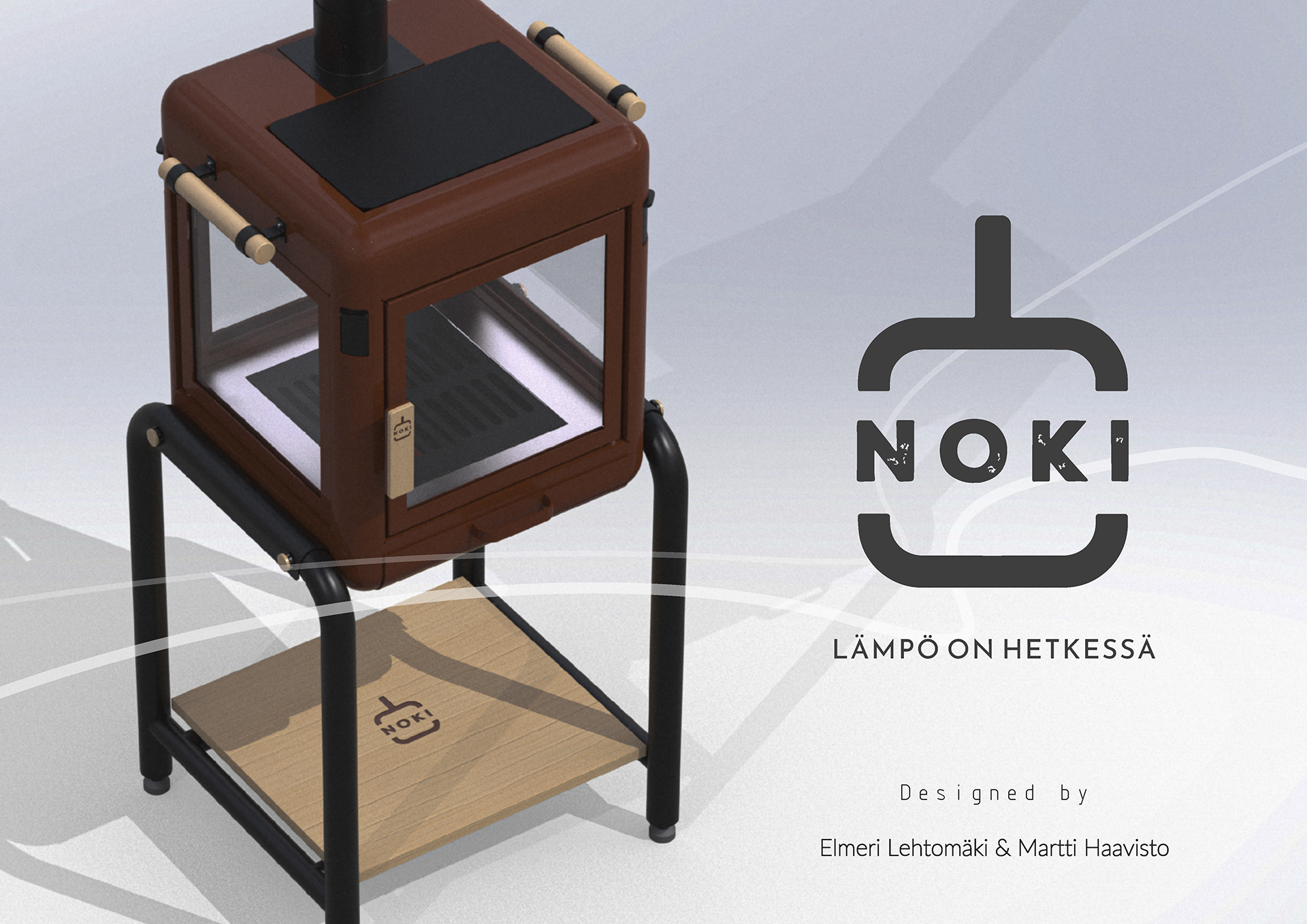 The NOKI outdoor fireplace is the work of me and my colleague Elmeri Lehtomäki. For this project, Elmeri took care of the 3D modeling, while I focused on the visual look and branding. The design of the product and all related solutions down to the details, as well as the background work related to the design, we’ve done together.