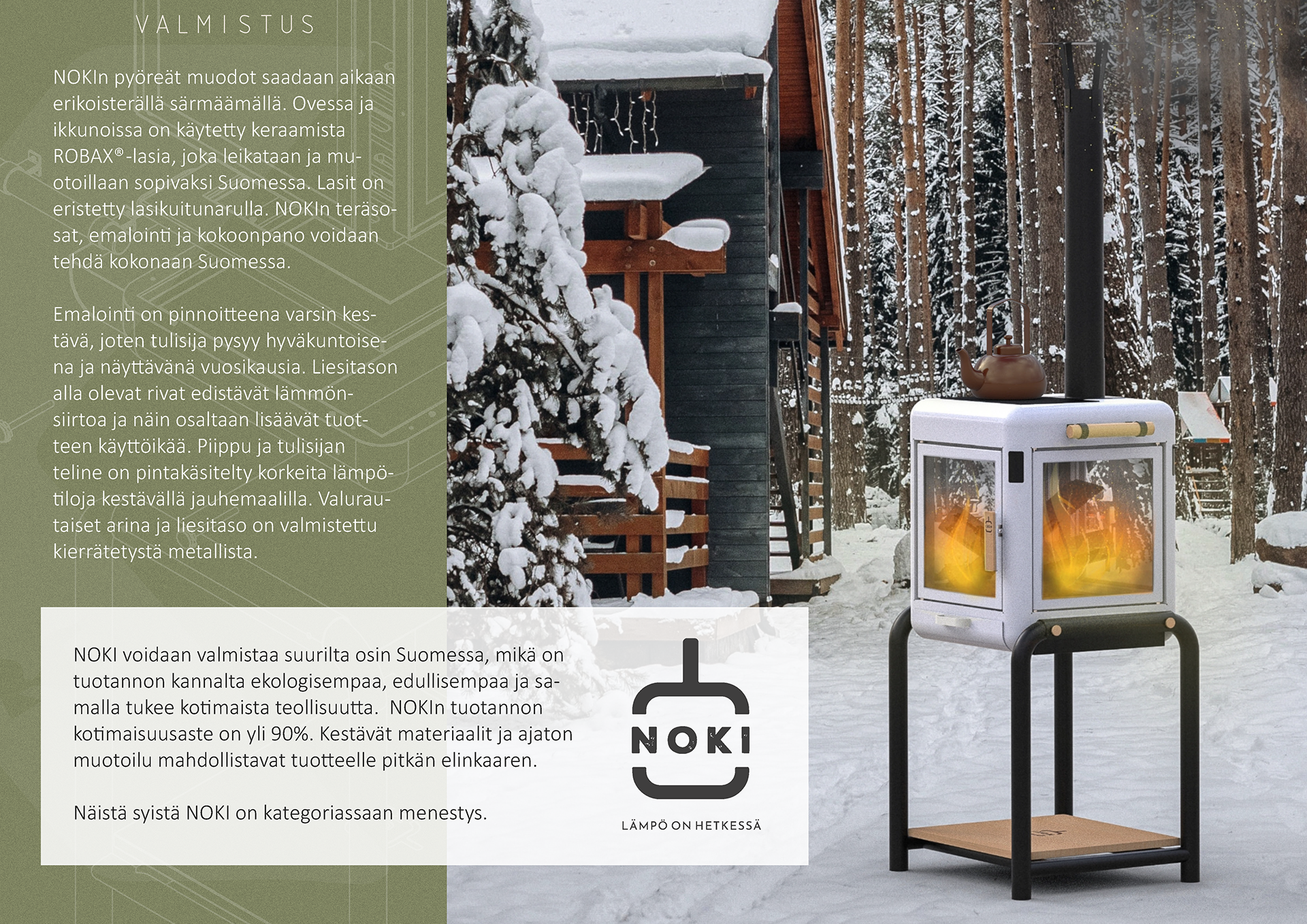 NOKI is inspired by communities and shared unforgettable moments. Because we wanted NOKI to be approachable and inviting, just like a small warm cabin in the middle of a winter forest, with its design we aimed to communicate warmth, softness and security. Our goal was to design NOKI attractive, user-friendly and ecological, and in terms of its structure and material choices in a way its production could possibly be carried out entirely in Finland. During the design process, we took into account the technical aspects of production as much as possible, thus there are exact dimensions and technical drawings for the fireplace. Therefore, NOKI is a production-ready concept. It can be produced almost entirely in Finland; its domestic production rate is over 90%. Naturally, the assembly of the product can be carried out completely in Finland.